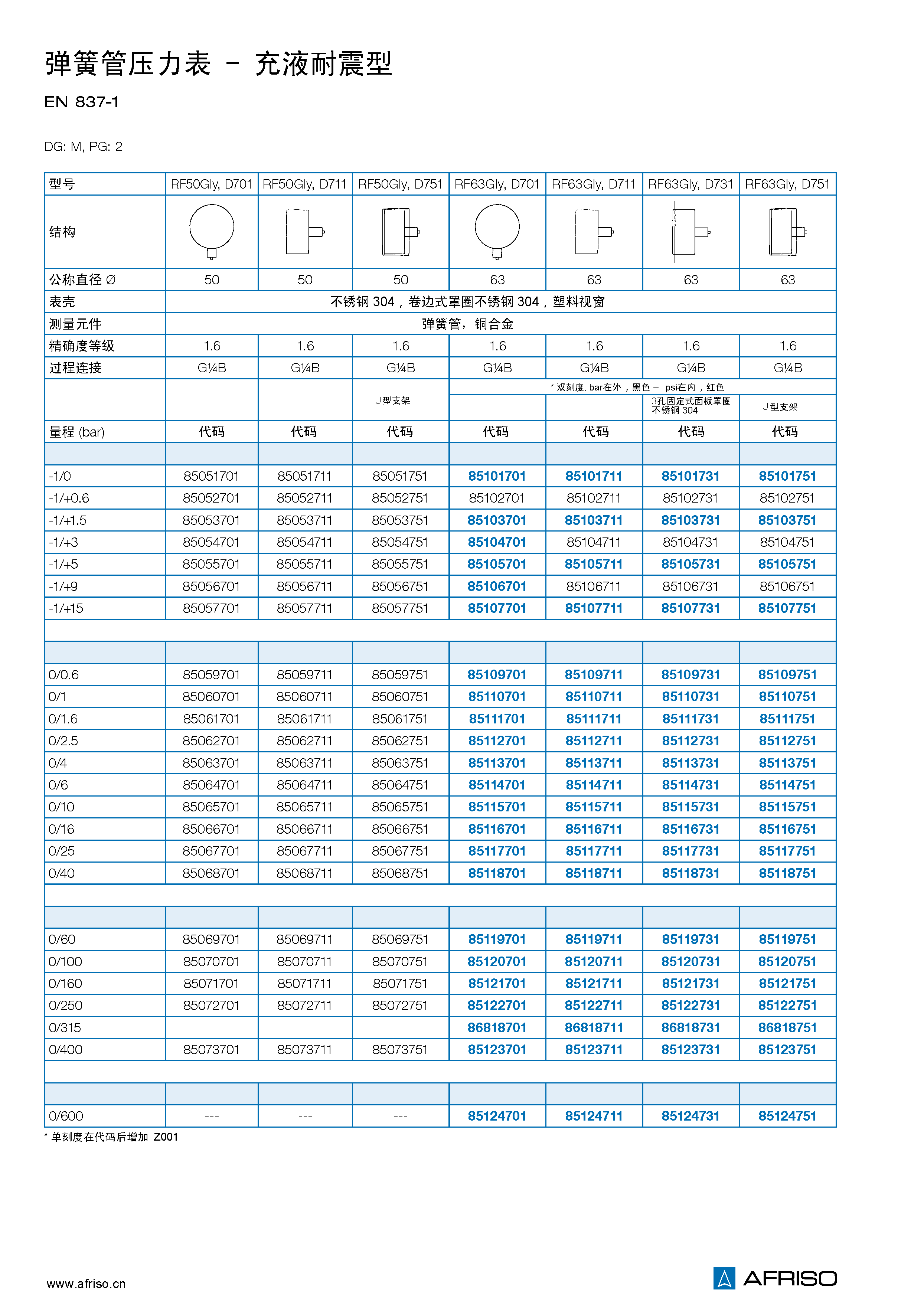-0.1/0 MPa到-0.1/+1.5 MPa 0/0.06到0/40 MPa NG63到0/60 MPa |
