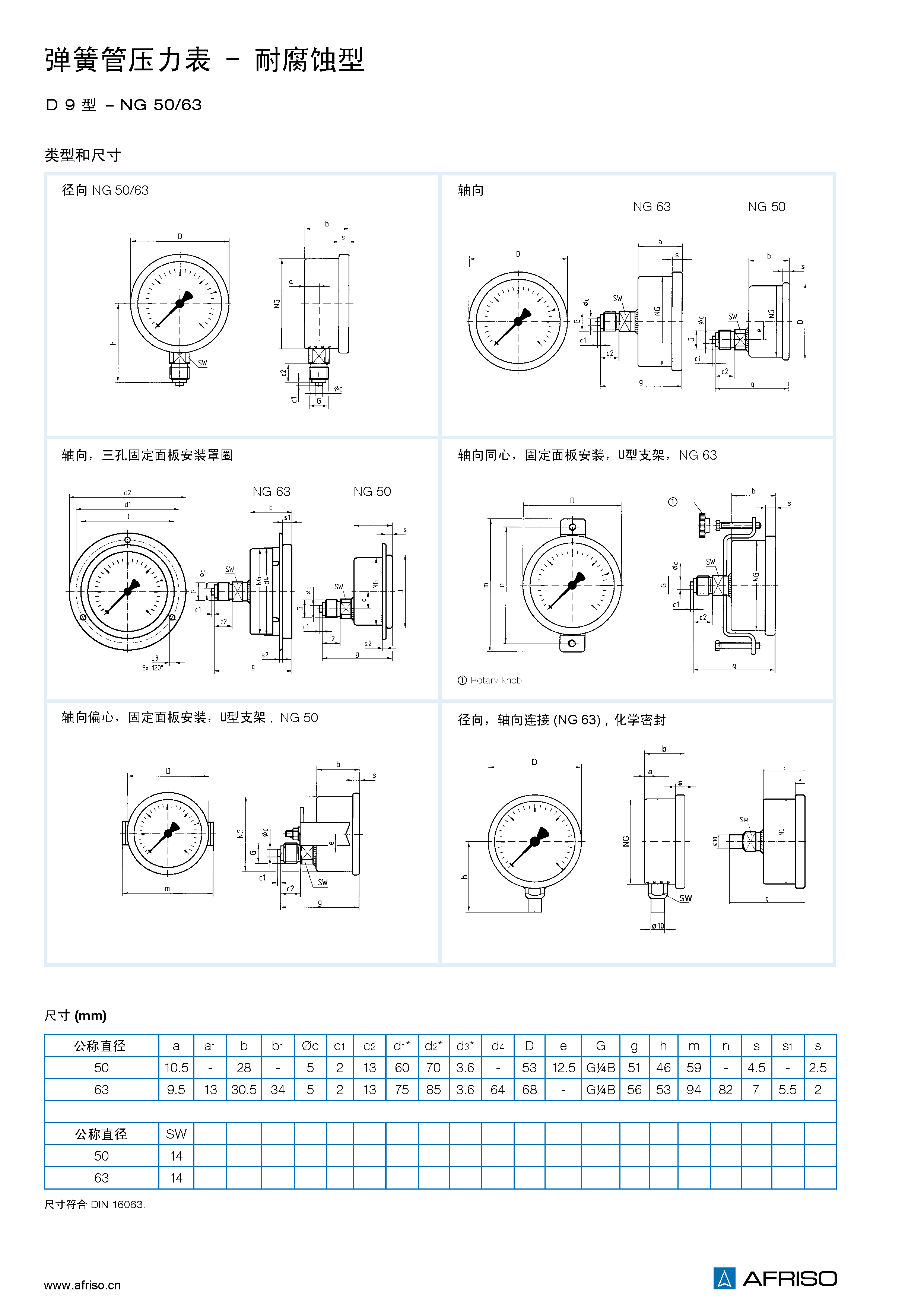 不銹鋼316L, NG50 徑向或軸向偏心 NG63 徑向或中心軸向 G1/4B – SW14 (EN837-1 / 7.3) |