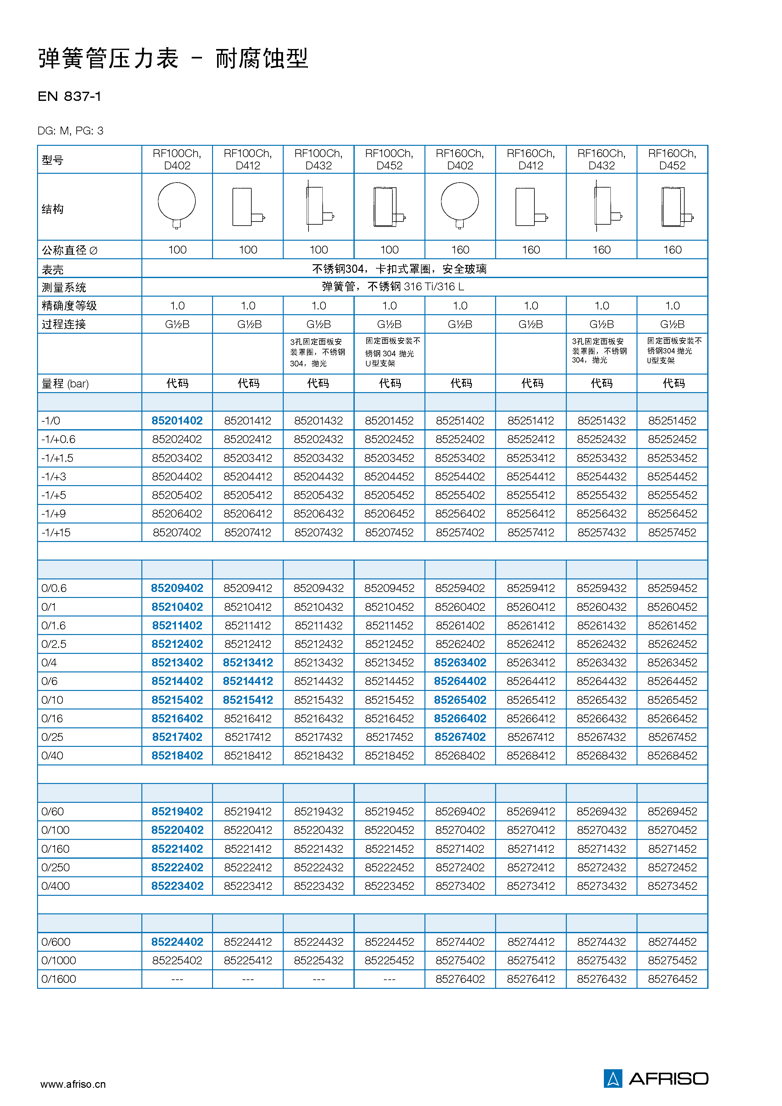 -0.1/0 MPa到-0.1/+1.5 MPa NG 100 0/0.06到0/100 MPa NG 160 0/0.06到0/160 MPa |