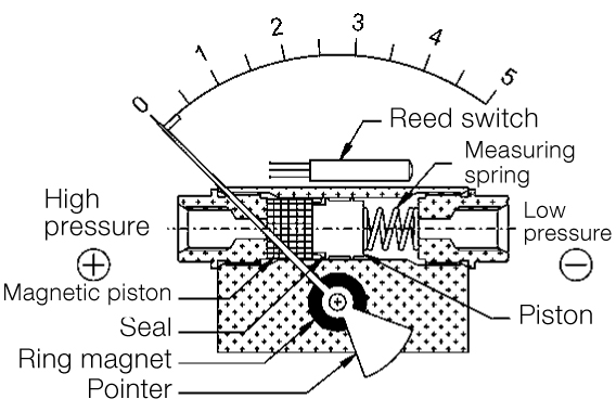 壓力作用在被電磁活塞隔開的兩個壓力腔內。如果兩壓力腔的壓力有差異,電磁活塞就會頂著彈簧產生位移,電磁線圈將這個位移通過裝在指針座上的電磁線圈傳遞給指針。壓差直接由兩側的指針指示。壓力腔和顯示盤完全的機械隔離,排除了泄漏的可能。