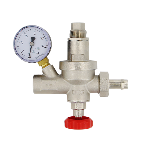 定壓補水閥殼體和彈簧帽由黃銅制成。 軟管內徑入口為12 毫米,出口G? 內螺紋。集成減壓閥,截止閥 和防回流閥。入口壓力0.6 至1.0 MPa,出口壓力在0.05至0.3 MPa 范圍可調節(jié)。 |