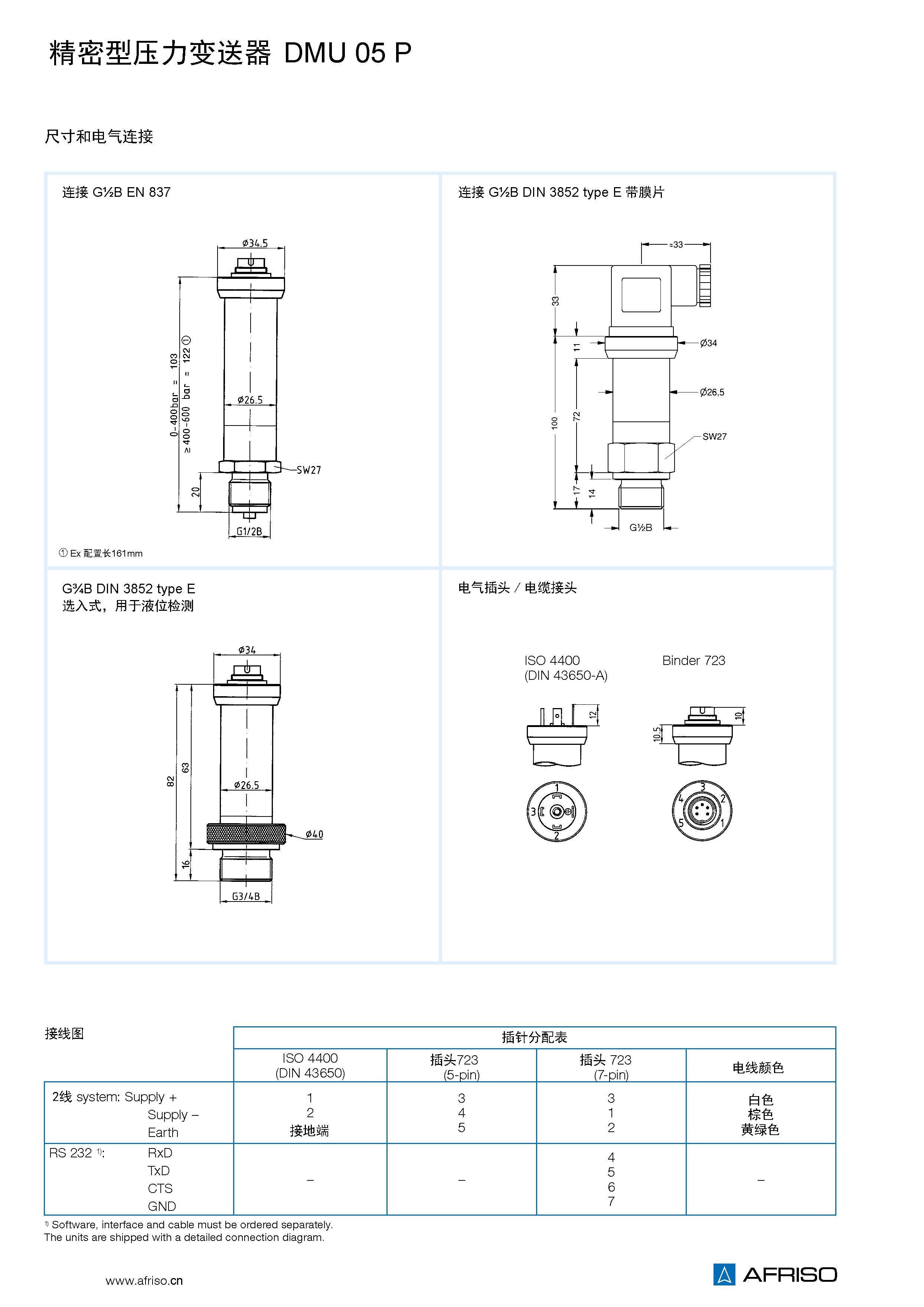 壓力變送器將物理壓力轉換成與壓力成正比的電信號。DMU 05 的測量單元是充油的壓電硅。DMU 05變送器配備了數字 放大電路(微處理器和16位A/D轉換)。 DMU 05 P 可補償傳感器偏差(非線性,溫度偏差),實現精確的檢測功能。 DMU 05也可選配RS 485 Modbus RTU,用以設定偏差,量程,阻尼系數。 |